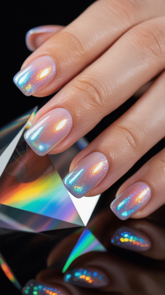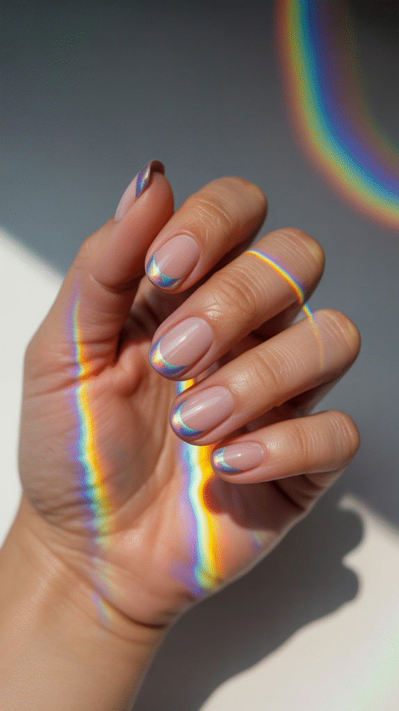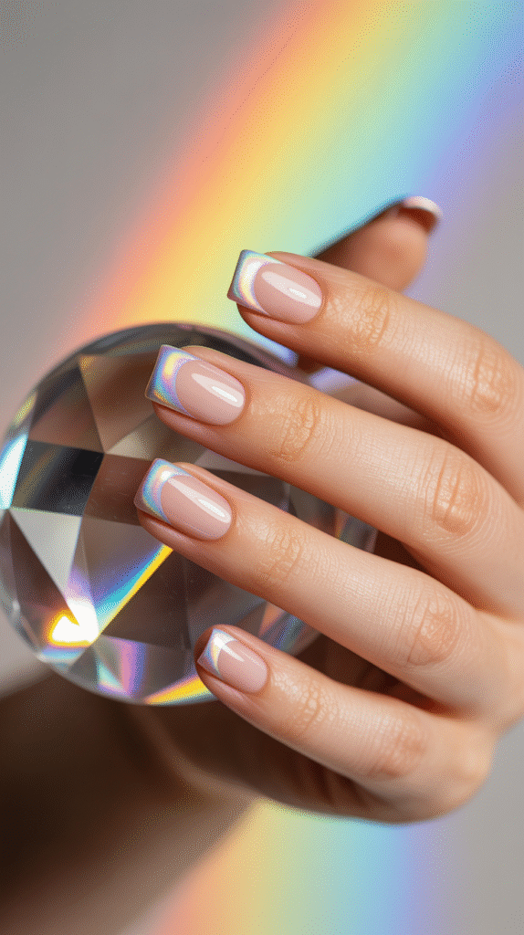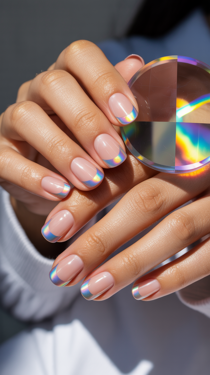 14. Holographic French Tip – Iridescent Futuristic Shine