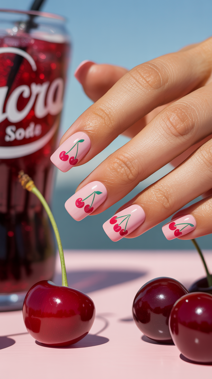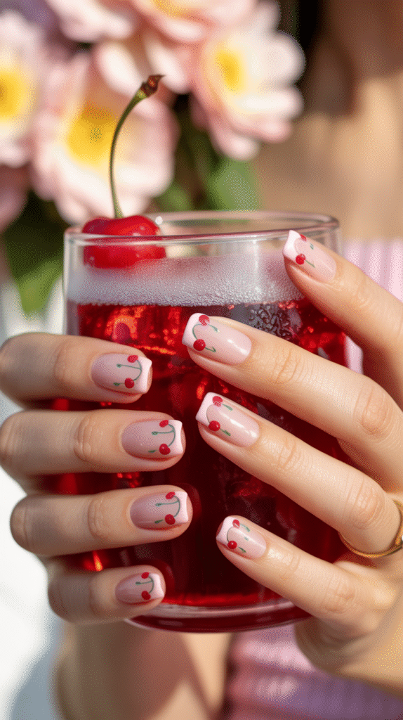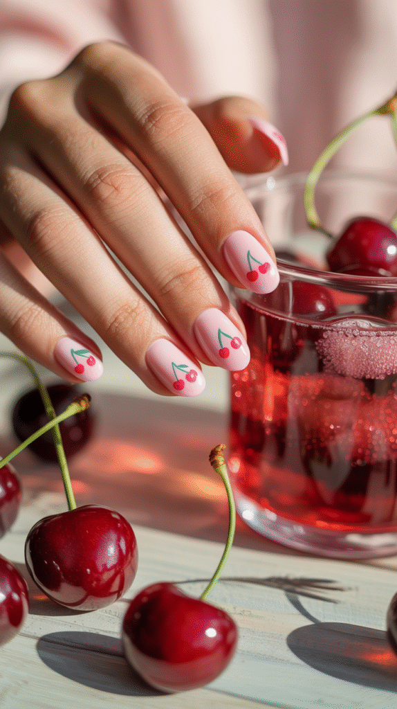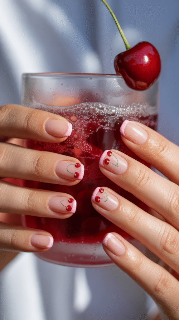 16. Pink Cherry‑Accent Tips – Fun Fruity Motifs
