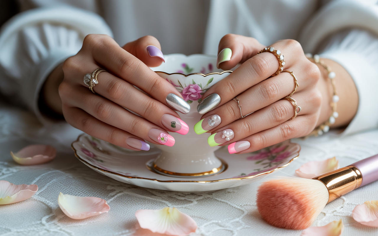 In spring, soft pastels and flowers are popular. I choose soft pink or baby blue French tips with flower designs for a feminine look. Summer brings bold colors like white tips with coral or turquoise.